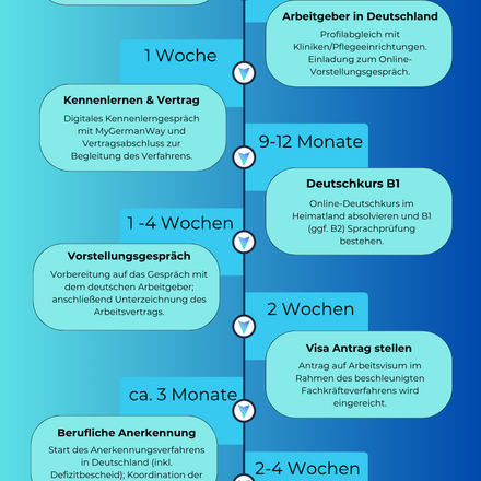 With MyGermanWay, you move step by step towards your new position in the German healthcare sector. Our team reliably guides you through all phases, from applying in your home country to becoming a recognized professional in Germany.