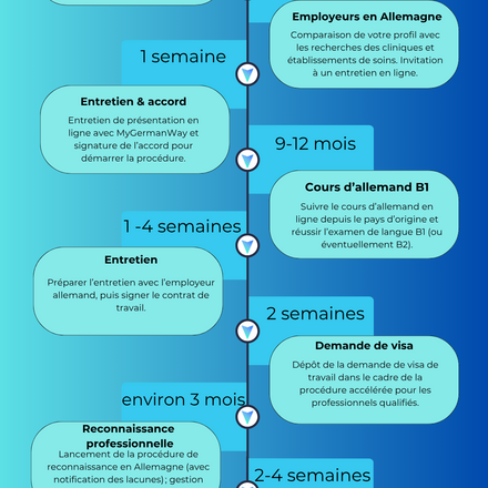 Avec nos partenaires, nous t’assistons pour la demande de visa et la reconnaissance professionnelle en Allemagne. Grâce à la procédure accélérée pour professionnels qualifiés, cette étape dure généralement environ trois mois.