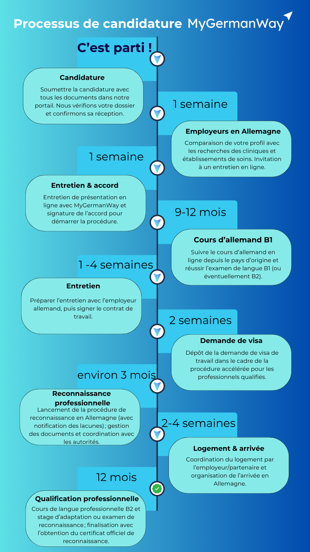 Avec MyGermanWay, tu avances étape par étape vers ton nouveau poste dans le secteur de la santé en Allemagne. Notre équipe t’accompagne de manière fiable à travers toutes les phases, de la candidature dans ton pays d’origine jusqu’à la reconnaissance officielle de ta qualification en Allemagne.